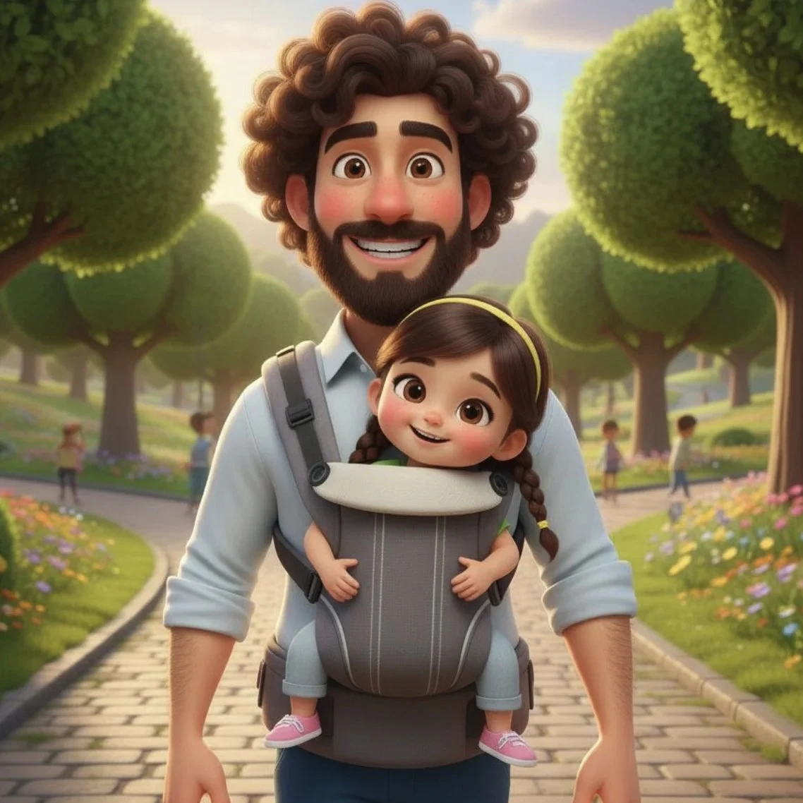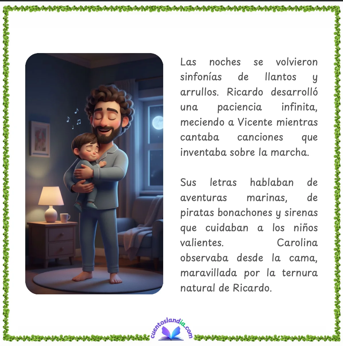 Carolina empezó creando los avatares de la familia en Cuentoslandia. Personalizó a Ricardo con su pelo castaño y barba corta, a Vicente como el bebé que era entonces. Luego, en la descripción, incluyó los detalles que solo ella conocía: las canciones inventadas sobre piratas vascos a las 3 AM, los cojines colocados estratégicamente por todo el apartamento durante semanas para los primeros pasos de su hijo.