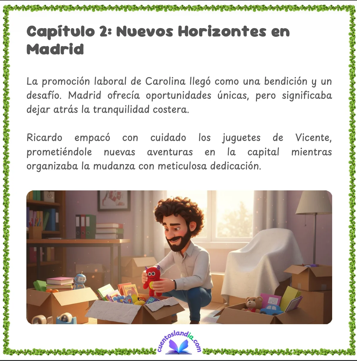 Para el segundo capítulo, Carolina añadió el avatar de Catalina y describió la mudanza a Madrid. Indicó en el campo libre cómo Ricardo empacó los juguetes de Vicente con dedicación meticulosa, sin reproches. Cómo pintó estrellas fosforescentes en el techo de la nueva habitación, una por una, mientras ella esperaba a Catalina.